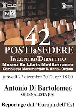 ORTONA (CH) – All’interno del Museo Ex Libris Mediterraneo,Complesso Monumentale Sant’Anna in Corso Garibaldi 1 a Ortona,continua il ciclo di appuntamenti “42 posti a sedere” a cura di progetti Farnesiani. Giovedì 27 dicembre alle ore 18 si avrà l’occasione di ascoltare Antonio Di Bartolomeo, giovane giornalista Rai.