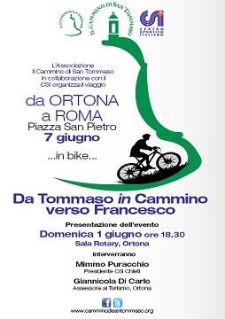 ORTONA (CH) – L’Associazione Il Cammino di San Tommaso torna a pedalare sui sentieri e sulle antiche strade consolari che conducono a Roma.Quest’anno Papa Francesco incontrerà il 7 giugno tutte le società sportive in occasione dei 70 anni del CSI Centro Sportivo Italiano e sarà proprio questa l’occasione che porterà i ciclisti che vogliono aderire all’iniziativa “Da Tommaso in cammino verso Francesco” organizzata dall’Associazione in collaborazione con il CSI di Chieti, a prepararsi per la partenza da Ortona fissata per il 6 giugno. Sono 280 i km da percorre sulla Tiburtina Vecchia nella due giorni di viaggio per raggiungere Piazza san Pietro e fare festa con i colori di tutte le società sportive italiane affiliate al CSI.Il CSI di Chieti ha avuto modo di entrare in contatto con l’Associazione ortonese sin dall’anno scorso in occasione dell’iniziativa “Da Tommaso a Pietro in Cammino” che si è svolta dal 26 maggio al 9 giugno, con partenza da Ortona, alla quale hanno preso parte tanti camminatori, cavalieri e ciclisti provenienti dall’Abruzzo, dall’Italia e da nazioni estere, i quali hanno percorso, pedalato e calcato il lungo itinerario che collega Ortona a Roma per essere accolti, all’arrivo, da Papa Francesco.