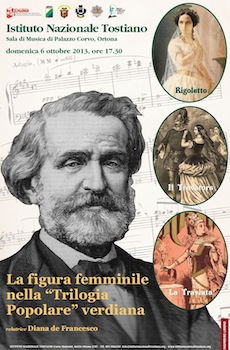 La figura femminile nella trilogia popolare di Verdi è il seminario che l’Istituto Nazionale Tostiano dedica domenica 6 ottobre 2013 alle 17.30, nella Sala di Musica di Palazzo Corvo, all’apertura delle celebrazioni verdiane, che incontrano felicemente i festeggiamenti per il trentennale dell’Istituto stesso.