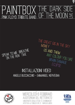 I Paintbox sono: Roberto Mastro (voce, chitarre), Giulio Galli (chitarre), Andrea Onofri (sax tenore), Fabrizio Carota (voce, basso), Andrea Andreoli (tastiere, cori), Claudia Costantino (cori), Tiziano Cantagallo (batteria). Le installazioni video saranno curate e realizzate da: Emmanuel Nervegna e Angelo Bucciacchio. Concept album uscito nel 1973, “The Dark Side of the Moon” nel giugno del 2011 ha addirittura superato le 1000 settimane di presenza nelle classifiche statunitensi ed è fra i più venduti album di sempre (superate le 50 milioni di copie nel mondo).