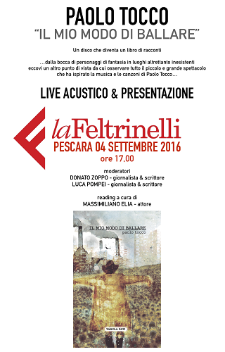 PESCARA – Domenica 4 settembre alle ore 17 presso la libreria La Feltrinelli di Pescara presentazione del volume “Il mio modo di ballare” (Tabula Fati Editore) del cantautore abruzzese Paolo Tocco.