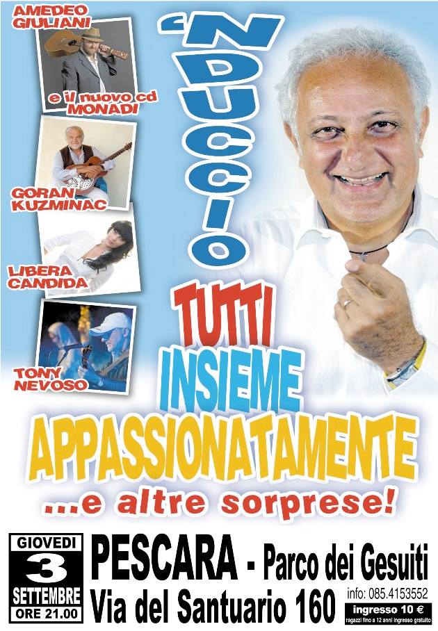 PESCARA – Giovedì 3 settembre al Parco dei Gesuiti è in programma lo spettacolo: Tutti insieme appassionatamente. Dove c’è da far beneficenza c’è la risposta di ‘Nduccio, e questa volta per un suo amico, per un nostro amico, per un amico di tanti Pescaresi che lo hanno conosciuto e apprezzato per le grandi doti umane, padre Pino Piva ex parroco dei Gesuiti, oggi in terra di Albania dove la sua presenza è stata ritenuta fondamentale.