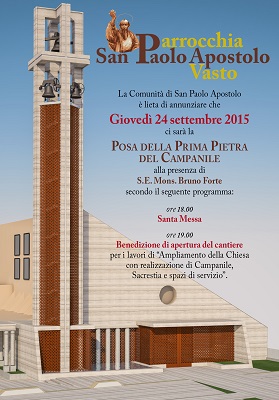 VASTO (CH) – La Comunità di San Paolo Apostolo è lieta di annunciare che giovedì 24 settembre 2015, alla presenza di S.E.Mons. Bruno Forte, ci sarà la Posa della Prima Pietra del Campanile.