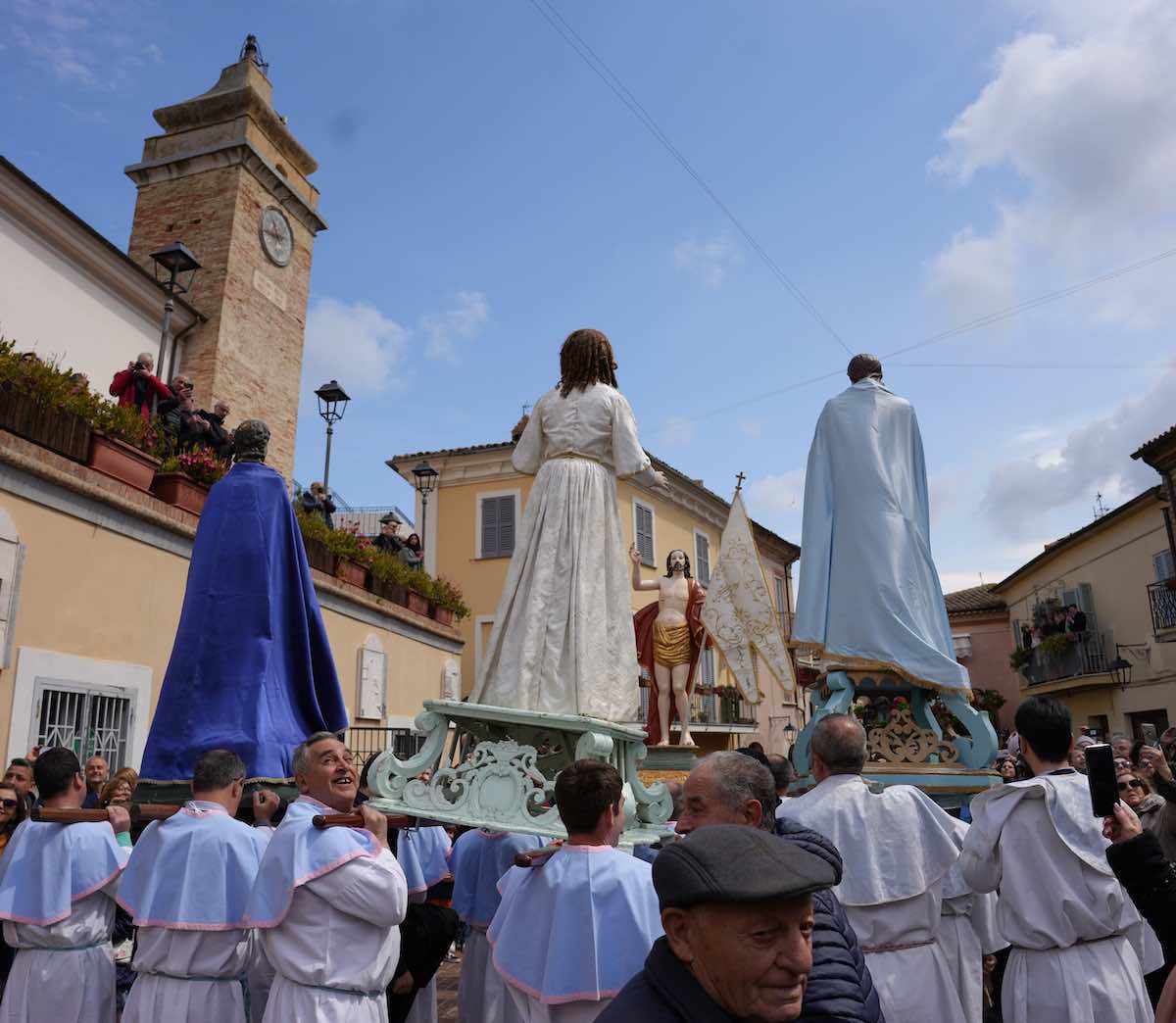 Alle 12:00, in Piazza D’Albenzio, andrà in scena l’emozionante rito dell’Abbandunàte, l’incontro tra la Madonna e il Cristo Risorto. La statua di Maria di Magdala percorre per tre volte la piazza correndo tra due ali di folla, annunciando la Resurrezione. Al terzo passaggio, le statue della Madonna, di San Giovanni e del Cristo si ricongiungono: la Vergine abbandona il lutto e si veste di bianco, mentre mortaretti e voli di colombe accompagnano l’esplosione della festa.