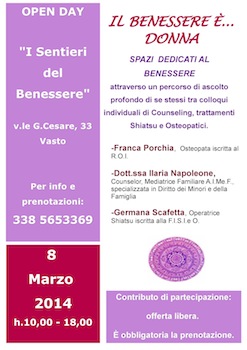 VASTO (CH) – La signora ,Germana Scafetta rende noto l’Appuntamento con il Benessere che si terrà a Vasto, presso lo studio di via Giulio Cesare 33, l’8 marzo 2014 dalle ore 10 alle ore 18. E’ necessario prenotare il trattamento o colloquio individuale di Counseling, Osteopatia e Shiatsu.