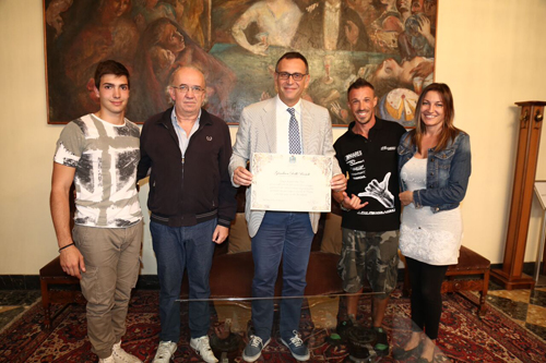 (Nella foto Gianluca Delli Rocioli con il sindaco Marco Alessandrini e l’assessore allo Sport Giuliano Diodati mentre riceve la pergamena)