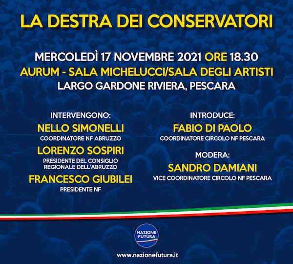 PESCARA – Domani, mercoledì, 17 novembre 2021, nella sala Michelucci dell’Aurum a Pescara , alle ore 18.00, in occasione della presentazione del circolo cittadino di Nazione Futura, l’associazione presieduta da Francesco Giubilei – editore, docente universitario, giornalista, commentatore televisivo, componente del Comitato scientifico sul futuro dell’Europa istituito dal governo – si terrà una conferenza intitolata “La destra conservatrice”.