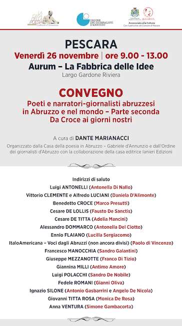 PESCARA – Venerdì 26 novembre 2021, dalle ore 9.00 alle ore 13.00, presso la Sala d’Annunzio dell’Aurum – La Fabbrica delle idee, Largo Gardone Riviera, Pescara, si terrà il convegno “Poeti e narratori-giornalisti abruzzesi in Abruzzo e nel mondo – Parte seconda. Da Croce ai giorni nostri”, ideato e curato da Dante Marianacci, organizzato dalla Casa della poesia in Abruzzo – G. d’Annunzio e dall’Ordine dei giornalisti d’Abruzzo, con la collaborazione della Ianieri edizioni e con il patrocinio del Comune di Pescara.