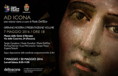 Nella giornata inaugurale di sabato 7 Maggio alle ore 18, saranno visibili una selezione di fotografie incluse nel volume Ad Icona e ci sarà una tavola rotonda con i contributi di Mariano Cipollini, critico d’arte e Paolo Dell’Elce: “L’idea di osservare come alcune iconografie religiose possano ancora agire una volta estrapolate dalle chiese e dai luoghi di culto in generale, decontestualizzate e desacralizzate, ricollocate in una nuova realtà, ma soprattutto in un altro tempo nasce all’interno delle sale del Museo Capitolare di Atri dall’incontro rivelatore con alcuni busti reliquiari di epoca barocca.” Così Paolo Dell’Elce, fotografo, teorico e docente dei linguaggi visivi, parla del volume edito da DELLOIACONO EDIZIONI”.