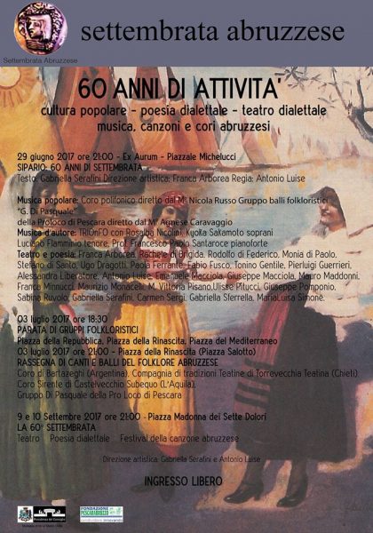 Gli eventi del 60° si concentreranno soprattutto a PESCARA, grazie alla collaborazione della Presidenza del Consiglio Comunale e della Fondazione Pescarabruzzo, in modo che la città si riappropri di un settore culturale che negli ultimi tempi è stato un po’ in sofferenza, e per dare un messaggio forte sulla cultura popolare, per intenderci quella che si richiama alle nostre radici tradizionali, che ha visto intellettuali, ricercatori, musicisti, drammaturghi e poeti penetrare nell’animo abruzzese e restituire suggestivi linguaggi artistici”.