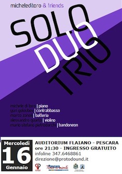 PESCARA – L’Assessorato alla Cultura del Comune di Pescara,Protosound Polyproject e ‘Michele Di Toro & Friends’ presentano “SoloDuoTrio”. Il concerto ad ingresso gratuito si terrà mercoledì,16 Gennaio 2013, alle ore 21.30, all’Auditorium Flaiano di Pescara.