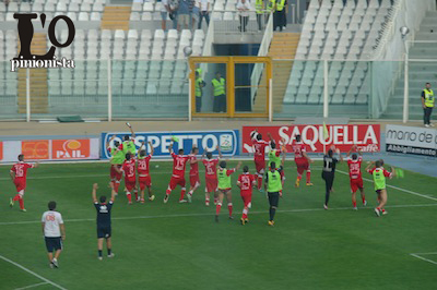 esultanza-giocatori-Bari-all'Adriatico-a-fine-partita Decide una rete dell’attaccante biancorosso. I biancoazzurri appena sufficienti nel primo tempo, confusionari nella ripresa recriminano su due episodi