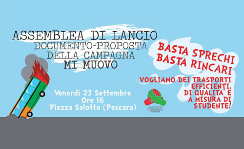 23 settembre 2016, alle ore 16, in Piazza Salotto, si terrà l’assemblea di lancio del documento/proposta “Mi Muovo” , per un servizio di trasporto pubblico gratuito, efficiente ed a misura di studente.