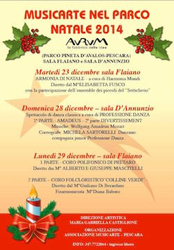 PESCARA – Questa sera alle ore 21, presso la Sala Flaiano dell’Aurum, concerto Armonia di Natale, di Musicarte nel Parco Natale 2014 sotto la direzione artistica di Maria Gabriella Castiglione, a cura di Harmonia Mundi. L’ensemble dei piccoli del Setticlavio si esibirà con la direzione del Maestro Elisabetta Fusco. Questo il commento dell’assessore alla Cultura Giovanni Di Iacovo sull’evento: