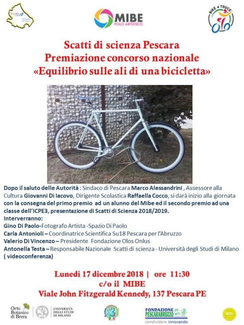 PESCARA – Lunedì 17 dicembre 2018,alle ore 11.30,presso il Mibe,in viale Kennedy,137 a Pescara si terrà la premiazione del concorso nazionale ” L’Equilibrio sulle ali di una bicicletta”,promosso da Su18 Pescara in collaborazione con la fondazione OLOS onlus.
