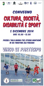 PESCARA – Venerdì 5 dicembre dalle ore 10 alle 12, presso presso l’aula magna dell’Istituto Tecnico Commerciale Aterno-Manthonè (via Tiburtina 202 a Pescara) si terrà il convegno “Cultura, società, disabilità e sport”. L’incontro è organizzato in collaborazione con l’Associazione Parco de Riseis e sarà un’occasione per affrontare le tematiche relative al nuovo modo di vivere la disabilità nella società moderna, cercando di fornire una visione integrata che comprenda i molteplici aspetti tra loro legati: dalla moderna visione culturale della disabilità, al nuovo e più adeguato obiettivo che ci si deve proporre in questo ambito, ossia dell’inclusione sociale delle persone diversamennte abili, processo in cui lo sport risulta essere uno strumento facilitatore.