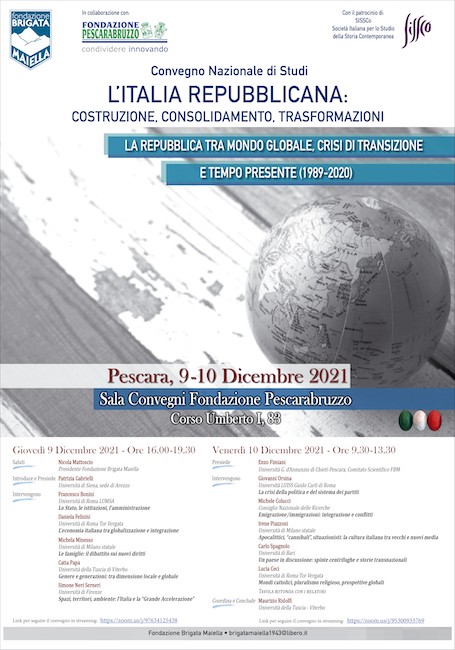 Durante le due giornate di studio, che si svolgeranno oggi, giovedì 9 dicembre e domani, venerdì 10 dicembre 2021 in Corso Umberto I, 87, gli storici, i docenti universitari e i ricercatori convenuti a Pescara focalizzeranno la loro attenzione sul periodo compreso tra il 1989 e il 2020, racchiuso nel tema “La Repubblica tra mondo globale, crisi di transizione e tempo presente”.