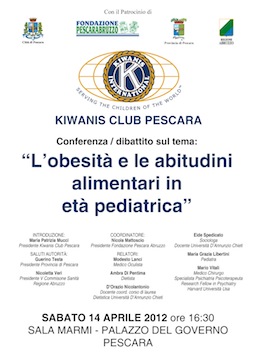 PESCARA- L’obesità e le abitudini alimentari in età pediatrica è il tema del convegno organizzato per oggi, sabato 14 aprile alle ore 16,30 presso la Sala dei Marmi della Provincia di Pescara.