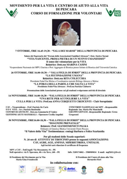 “Una rete per accogliere la vita”: di questo si parlerà nel terzo incontro del corso di formazione per volontari ed aspiranti tali che il Movimento per la Vita ed il Centro di Aiuto alla Vita di Pescara stanno realizzando.