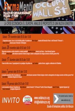 PESCARA – Oggi, 26 novembre ,alle ore 10.00, presso l’aula del Consiglio Regionale di Pescara in Piazza Unione, si terrà la seconda lezione del corso su” crisi economica e finanziaria: oltre l’indignazione, analisi e proposte”, promosso dalla Scuola di formazione politica e culturale di SEL Abruzzo.
