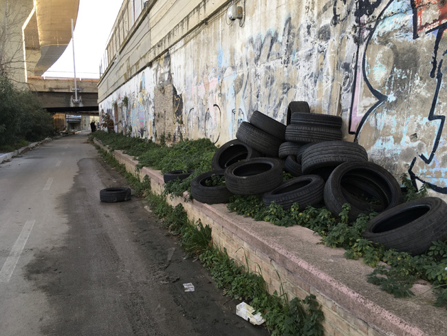 La rimozione dei copertoni di auto (cercando di risalire alla responsabilità del gesto), una riqualificazione igienico sanitaria dell’area, anche un intervento cromatico di estetica (imbiancamento) oltre che poi una pulizia periodica, con sfalcio erba e rimozione dei rifiuti, e forse anche il posizionamento di alcuni bagni chimici, renderebbero questo luogo sicuramente più civile.