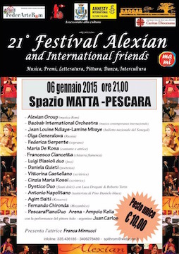 PESCARA – Domani, venerdì 2 gennaio alle ore 11:30 presso la Sala Commissioni del Comune di Pescara, si terrà la conferenza di presentazione della 21esima edizione dell’Alexian and International Friends. Presenteranno l’evento gli organizzatori con l’assessore alla Cultura Giovanni Di Iacovo. Comune di Pescara, FederArteRom e Caritas di Pescara sono uniti per portare nella città abruzzese un festival internazionale di grande spessore artistico e interculturale con la partecipazione di numerosi artisti. Un appuntamento che permetterà l’interazione fra diversi artisti, di diversa nazionalità e di diverse discipline artistiche: musica, danza, letteratura. Lo spettacolo e la premiazione di personaggi provenienti dai mondi del Festival si terrà martedì 6 gennaio dalle ore 21 in poi, presso lo Spazio Matta a Pescara. Il Festival ha un palma res importante alle spalle: Moni Ovadia, Dario Vergassola, Lorena Bianchetti, Rossana Casale, Paolo Brosio, Povia, Francesco Baccini.