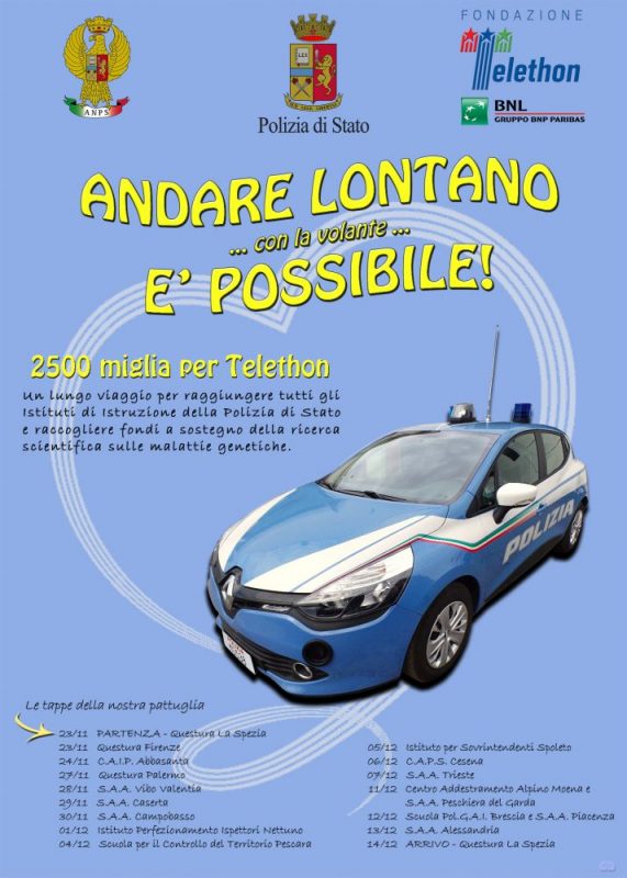 Tale progetto, caratterizzato dallo slogan “andare lontano e possibile”, interessa tutto il territorio nazionale, ha una durata complessiva di 22 giorni ed è stato avviato lo scorso 23 novembre con partenza dalla città di La Spezia di un’autovettura con i colori istituzionali, per sottolineare l’impegno e la presenza della Polizia di Stato a fianco dei soggetti più deboli.
