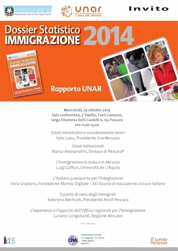 PESCARA – Il “Dossier statistico Immigrazione 2014”, affermatosi da anni come insostituibile strumento di conoscenza dei fenomeni di trasformazione della nostra società, sarà presentato a Pescara oggi, mercoledì 29 ottobre, nel corso di un incontro in programma nella sala convegni delle Torri Camuzzi, in Largo Filomena Delli Castelli 10, con inizio alle ore 11.