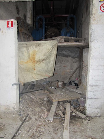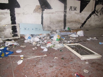 Il capannone più grande è una discarica: ovunque a terra ci sono pezzi di ferro, polistirolo, plastica, materassi sporchi gettati sul pavimento, cavi elettrici che sporgono dal soffitto, pezzi di porta spaccati, ovunque i frammenti dei vetri delle finestre finiti in frantumi, e nell’angolo nord c’è una sorta di alcova in cui è stata nascosta una bicicletta nuova di zecca, probabilmente frutto di un furto, e accanto una montagna di rifiuti alimentari, con scatole di vino vuote, scarti di cibo, pizze e altro pattume.
