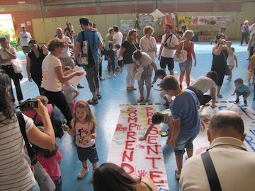 Subito dopo il sindaco Albore Mascia e l’assessore Cerolini hanno dispiegato un arazzo completamente dipinto lungo nove metri realizzato dagli stessi asili e che rappresenta ‘Il mondo visto con gli occhi dei bambini’, portato attraverso un girotondo all’interno del palazzetto. Quindi sono stati stesi a terra tre teloni con su scritto tre frasi diverse ossia ‘Imparare dal Passato’ ‘Per comprendere il presente’ ‘Per costruire il futuro’. Su ciascuno di essi il sindaco Albore Mascia e l’assessore Cerolini hanno lasciato l’impronta delle proprie mani intinte in una vernice colorata, imitati poi da bambini e genitori.