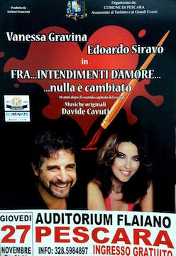 PESCARA – Domani mattina alle ore 12.30, presso la sala Giunta del Comune di Pescara, ci sarà la conferenza stampa di presentazione dello spettacolo “Fra…intendimenti d’amore, nulla è cambiato” che andrà in scena giovedì 27 novembre alle 21 presso l’auditorium Flaiano di Pescara. Si tratta di uno spettacolo organizzato dall’ assessorato a Turismo e Grandi Eventi e che sarà gratuito per la cittadinanza. Protagonisti dell’evento saranno Vanessa Gravina e Edoardo Siravo, quest’ultimo sarà presente all’incontro per illustrare l’appuntamento assieme all’assessore a Turismo e Grandi Eventi Giacomo Cuzzi.