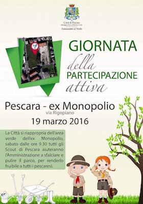 PESCARA – Domani, sabato 19 marzo, a partire dalle ore 9.30 presso l’area verde dell’ex Monopolio di Stato in via Rigopiano/via Passolanciano si svolgerà la giornata della “Partecipazione attiva”. Si tratta di un evento promosso dall’Amministrazione comunale, che vede coinvolti tutti i gruppi scout del distretto di Pescara (Rover e Scorte), i gruppi Scout di Federazione Scout Europa, Agesci , Cnj e Pescara 1 (Spirito Santo).