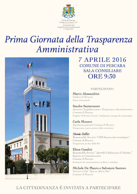 PESCARA – “L’attuazione del Piano della Trasparenza e dell’Anticorruzione dell’Ente è a tutti gli effetti un percorso volto a coinvolgere i cittadini e tutti i portatori di interessi sociali, culturali ed economici diffusi – dice l’assessore alla Semplificazione e Trasparenza Amministrativa Sandra Santavenere – La giornata sarà un’occasione privilegiata di conoscenza per tutti: cittadini, istituzioni, imprese, professionisti ed associazioni. Un momento di confronto e di condivisione di esperienze ed esigenze in un’ottica di democrazia partecipata e di un più consapevole senso civico”.