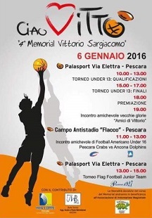PESCARA – Nel giorno dell’Epifania presso il campo “Flacco” di Pescara si è svolto il 4° memorial “Ciao Vittò” dedicato a Vittorio Sargiacomo, uomo di sport appassionato di basket e football americano che ha giocato nei Crabs Pescara e negli Ancona Dolphins.