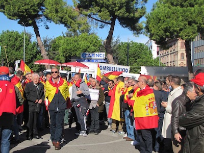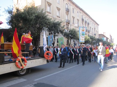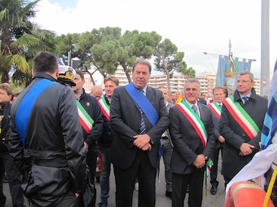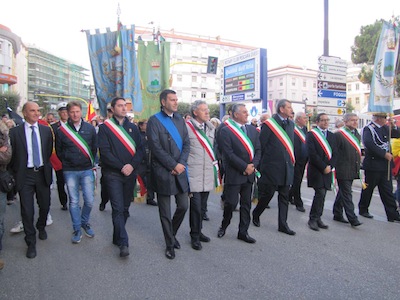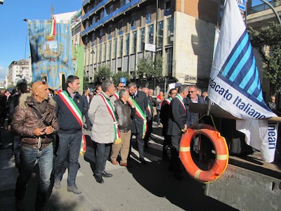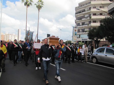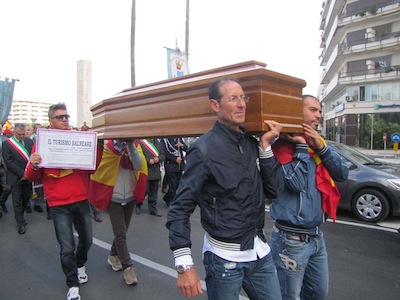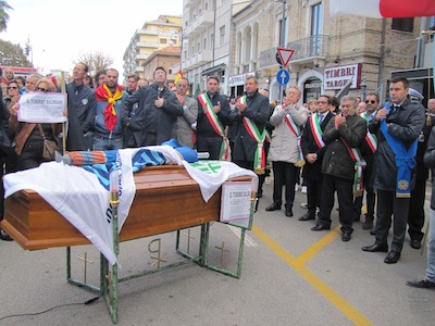 Dopo l’intervento anche del Presidente Testa, il corteo ha ripreso il proprio cammino dirigendosi verso il ponte dell’asse attrezzato per raggiungere piazza della Marina dove ci sono stati la terza sosta con il saluto istituzionale al Comandante della Direzione marittima Luciano Pozzolano e l’intervento di Mimmo Grosso, per esprimere solidarietà ai balneatori e ricordare anche il dramma del mancato dragaggio del porto canale, per poi indirizzare un saluto ai due Marò ancora prigionieri in India. Infine la ripresa del corteo, con la bara portata a spalla, sino in piazza Unione, con la sosta finale sotto il Palazzo del Consiglio regionale, alla presenza dell’assessore Mauro Di Dalmazio.