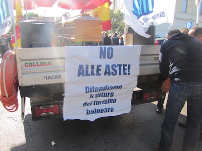 PESCARA – Dopo il funerale della marineria pescarese oggi si è celebrato quello delle imprese balneari: il mancato dragaggio del porto e la Direttiva Bolkestein rischiano di mettere ko non solo tali imprenditori, ma l’economia di tutta la città. Questa mattina si è svolta dunque a Pescara la manifestazione regionale di protesta contro tale direttiva comunitaria, organizzata da tutte le sigle sindacali del comparto balneare e a cui hanno partecipato oltre 400 persone.Presenti alcune delle massime figure istituzionali, tra cui, oltre al sindaco Albore Mascia, anche i Presidenti delle Province di Pescara Guerino Testa e Chieti, Enrico Di Giuseppantonio, l’assessore regionale Carlo Masci, i sindaci di Pineto Luciano Monticelli, rappresentante Anci sulla tematica, Lorenzo Chiulli, in rappresentanza del Comune di Montesilvano, e poi molti altri sindaci di Alba Adriatica, Villa Rosa, Tortoreto, sino alle Marche, e presente anche una delegazione dell’Associazione Armatori, con Mario Camplone, Francesco Scordella e Mimmo Grosso. Il corteo è partito intorno alle 10 da piazza della Repubblica: ancora una volta ad aprire il lungo serpentone un furgone con all’interno una bara, “simbolo della morte delle nostre imprese balneari destinate, oggi, ad andare all’asta, decretando la fine di intere famiglie che su quelle concessioni hanno costruito la loro intera esistenza, tra mille sacrifici, effettuando investimenti ingenti caricandosi sulle spalle una montagna di debiti che nessuno ci verrà a coprire”, ha detto Riccardo Padovano, del Sib-Confcommercio che ha guidato la protesta odierna.