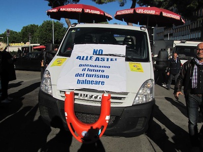 Il corteo ha dunque percorso lentamente il centro della città, con una prima sosta in corso Vittorio Emanuele, dinanzi alla sede dell’Aptr, dove Padovano e altri balneatori hanno affisso il manifesto funebre dedicato alle imprese balneari. Quindi il corteo ha ripreso la sua lenta marcia sino al Comune dove ha preso la parola il sindaco Albore Mascia: