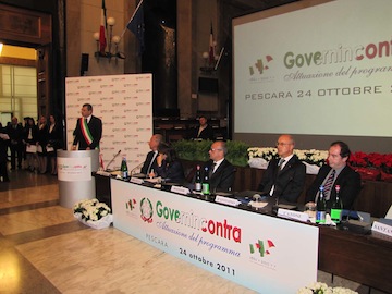 ggi stiamo attraversando un momento istituzionale difficile, in cui il governo di un paese si considera un ‘affanno’ non consigliabile e in cui le stesse opposizioni sono più spaventate di noi di dover guidare il paese. Nonostante la giornata odierna richiedesse la massima presenza a Roma, abbiamo deciso di confermare l’incontro di Pescara sperando di segnare una data in cui la legislatura più problematica della Repubblica infili la strada di completamento del rilancio del progetto in cui riforma fiscale, riforma della giustizia e riforma istituzionale riavvicinino i cittadini alle Istituzioni che non sono la ‘casta’, ma sono la rappresentanza del popolo.Dedico innanzitutto un pensiero a una figura politica che tanto ha rappresentato per l’Abruzzo, l’onorevole Remo Gaspari , scomparso da poco, al quale il Governo rivolge una volta di più la profonda gratitudine per quanto ha fatto per la sua terra e per l’Italia. Oggi attraversiamo un momento in cui non si possono più distribuire risorse, ma dobbiamo distribuire sacrifici, ricordando che il debito pubblico non è certamente il prodotto di un sistema di governo del Presidente Berlusconi né di Prodi. Sulle pensioni la riforma è necessaria, ma in realtà si tratta solo di un adeguamento al concetto di allungamento della durata media della vita.
