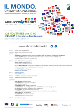 PESCARA – “Il mondo. Un’impresa possibile”, è questo il titolo del primo convegno di presentazione di “Abruzzo4Export”, il progetto multiasse finanziato dalla Regione Abruzzo (Assessorato alle Politiche Attive del Lavoro) con un milione e mezzo di euro di risorse del Fondo Sociale Europeo per potenziare le competenze professionali e manageriali delle aziende abruzzesi nel campo dell’internazionalizzazione. Il convegno si terrà a Pescara, oggi,venerdì 28 novembre 2014,a partire dalle ore 17.00, nel complesso “Torri Camuzzi” (Largo Filomena Delli Castelli, 10). Dopo i saluti dell’Assessore regionale Marinella Sclocco , del Direttore regionale Germano De Sanctis (Direzione Politiche Attive Del Lavoro, Formazione ed Istruzione, Politiche Sociali) e del Presidente della Provincia di Pescara, Antonio Di Marco,Marcello Romano della Deloitte Consulting Srl (società capofila di progetto) illustrerà obiettivi e azioni di “Abruzzo4Export”.