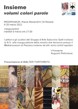 PESCARA – Dal 6 al 20 marzo presso il Mediamuseum, in piazza Alessandrini n°34 a Pescara, si terrà la mostra d’arte dal titolo “Insieme,volumi colori parole con opere di Sandro Arduini, Pasquale De Carolis, Paolo De Felice, Claudio Del Romano, Giovanni De Sanctis, Fabio Di Lizio, Augusto Pelliccione, Massimina Pesce, Antonio Rauco, Bruno Sabatini, Franco Angelosante, Vincenzo Bonanni, Riccardo Chiodi, Gianfranco di Berardini, Giampiero Gigliozzi, Stefano Ianni, Rezakhan.