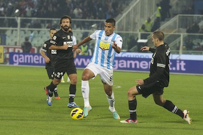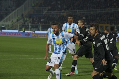 PESCARA – Pesante sconfitta per il Delfino che contro una Juventus formato maxi è costretta a subire un pesante passivo. Giochi fatti già dopo la prima mezz’ora con il 3-1 che manda un forte segnale alla squadra locale. Partenza sprint dei bianconeri che con grande determinazione tengono il campo e con cinismo ed un pizzico di “cattiveria agonistica” vanno ad infierire contro i malcapitati biancoazzurri. Da salvare la bella reazione che ha portato alla traversa di Quintero su punizione ed al 1-2 di Cascione. Nella ripresa Stroppa rilancia il 3-4-3 e la squadra si toglie definitivamente di dosso i timori reverenziali creando buoni sprazzi di bel gioco. Nel finale esagerata l’espulsione combinata al tecnico della squadra abruzzese che così dovrà saltare la delicata sfida della prossima giornata a Siena.