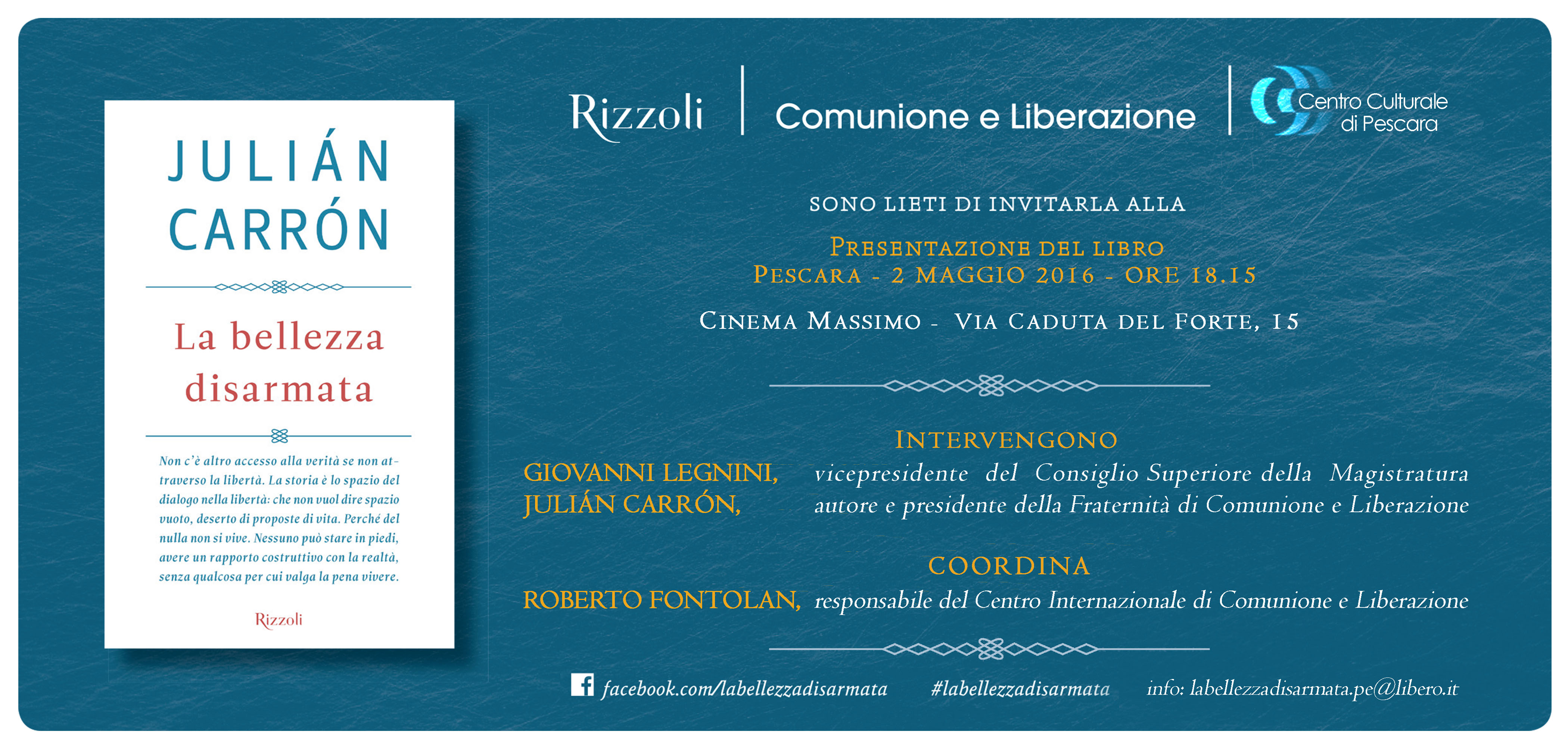 PESCARA – Lunedì 2 maggio 2016, alle ore 18.15, al Cinema Massimo di Pescara è in programma la presentazione del libro “La bellezza disarmata” di Julián Carrón.