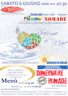PESCARA – Sabato 6 giugno il Nomadi Fans Club Abruzzo Nomade di Pescara festeggia il suo secondo compleanno, invitando tutti a: “Il Profumo del Mare”, cena-spettacolo di beneficenza, con ricavato devoluto a favore dell’associazione Adricesta Onlus (Ass. Donazione Ricerca Italiana Cellule Staminali Trapianto e Assistenza), che ha sede presso l’Ospedale Civile Pescara, Atrio Ingresso Degenti/Accettazione (e-mail: info@adricesta.com Tel. 085.20.56.770).