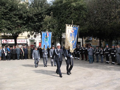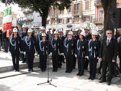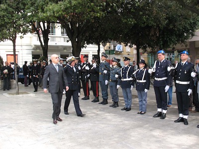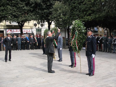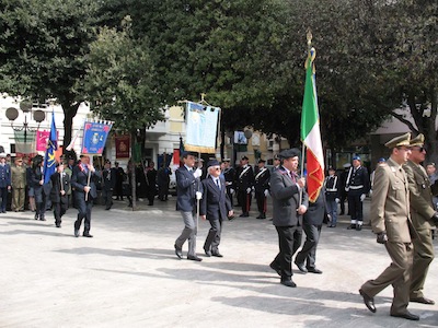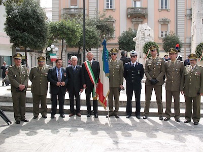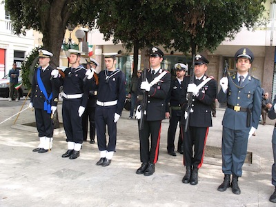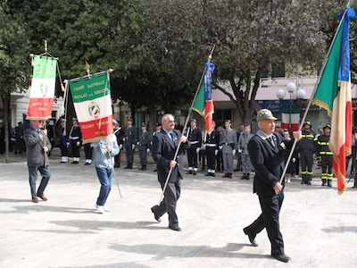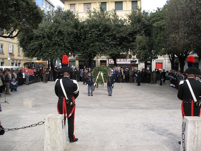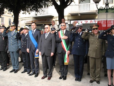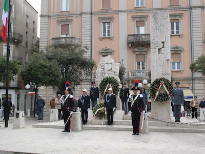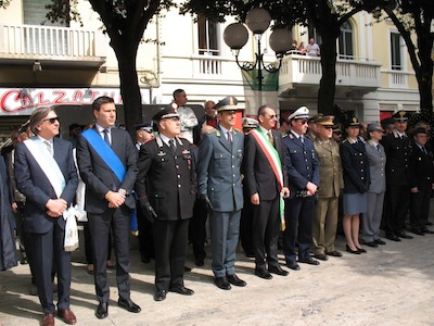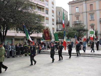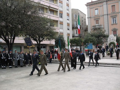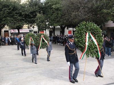 La cerimonia si è aperta alle 10 in punto con lo schieramento dei Reparti d’Onore e l’ingresso in piazza Garibaldi dei Labari e dei Gonfaloni raccolti ai lati del monumento ai Caduti. Quindi il picchetto d’onore con il passaggio del Prefetto D’Antuono in rassegna dei corpi militari, seguito dall’Alzabandiera, sulle note de Il Silenzio, rotto solo dall’applauso dei presenti, ad accompagnare l’Inno Nazionale cantato dal Coro Polifonico della Polizia municipale, diretto dal maestro Gianluca Emerico. Subito dopo il sindaco Albore Mascia, il Presidente Testa e il Prefetto D’Antuono hanno accompagnato le tre Corone, benedette da Don Francesco Santuccione, ai piedi del monumento ai Caduti per un minuto di raccoglimento e silenzio.