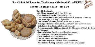 Il Convegno si aprirà con i saluti istituzionali dei sindaci di Pescara e Spoltore, Marco Alessandrini e Luciano Di Lorito, del Presidente della Provincia di Pescara Antonio Di Marco, degli assessori regionali al Benessere alimentare Silvio Paolucci e all’Agricoltura, Dino Pepe, dell’arcivescovo di Pescara Monsignor Tommaso Valentinetti, del Presidente Confcommercio Franco Danelli e della dirigente dell’Alberghiero, Alessandra Di Pietro. Quindi gli interventi del Presidente Assi-Pan D’Intino; del professor Giampiero Sacchetti, dell’Università di Teramo; David Falcinelli, della Coldiretti-Campagna Amica; la dottoressa Marina Manieri, dietista; Don Marco Pagniello, direttore della Caritas; e il professor Antonio Mobilij, docente dell’Università Chieti-Pescara ‘D’Annunzio’. Al termine sarà offerto un buffet preparato dagli studenti dell’Istituto Alberghiero ‘De Cecco’ sul tema del pane.