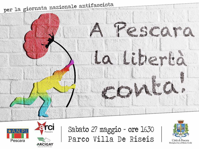 PESCARA – Sabato 27 maggio dalle ore 16.30 presso il parco Villa De Riseis, in occasione della giornata antifascista, il Comune di Pescara organizza insieme all’ANPI, all’Arci e all’Arci Gay di Pescara una giornata pacifica di riflessione e di intrattenimento legata ai diritti e parte integrante delle iniziative della Festa dei Parchi che si celebrerà in 15 aree verdi cittadine.