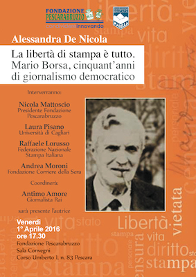 PESCARA – Venerdì 1 aprile 2016, alle ore 17.30. presso la sala convegni della Fondazione Pescarabruzzo, in Corso Umberto I, 83 a Pescara si svolgerà la presentazione del volume di Alessandra De Nicola: “La libertà di stampa è tutto. Mario Borsa, cinquant’anni di giornalismo democratico”.
