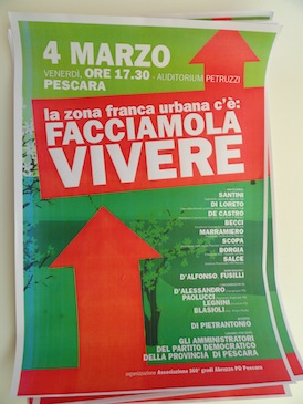 PESCARA – Venerdì 4 Marzo, alle ore 17.30 presso l’Auditorium Petruzzi a Pescara, si svolgerà un convegno organizzato dalla Associazione 360° e dal PD di Pescara, dal titolo: ” La zona franca urbana c’è: facciamola vivere” . Al dibattito interverranno numerosi esperti del settore a partire dall’ex ministro Paolo De Castro, l’ex sindaco di Pescara Luciano D’Alfonso, il presidente della camera di Commercio Becci e molti rappresentanti di spicco del Partito Democratico.