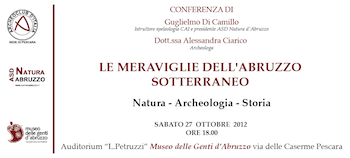PESCARA – Sabato , 27 ottobre 2012,alle ore 18.00, nell’ Auditorium “L.Petruzzi” presso il Museo delle Genti d’Abruzzo,in via delle Caserme, 60 a Pescara si terrà la Conferenza dal titolo “Le meraviglie dell’Abruzzo Sotterraneo” ( Natura – Archeologia – Storia) , organizzata da Archeoclub di Pescara, ASD Natura Abruzzo e Museo delle Genti d’Abruzzo . La Conferenza sarà tenuta da Guglielmo Di Camillo , Istruttore speleologia CAI e presidente ASD Natura d’Abruzzo e dalla Dott.ssa Alessandra Ciarico,Archeologa.