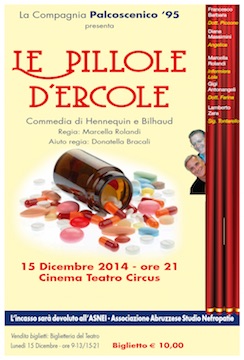 PESCARA – Oggi, lunedì 15 Dicembre, alle ore 21.00, al teatro Circus di Pescara la compagnia “Palcoscenico 95” presenta LE PILLOLE D’ERCOLE una commedia scritta da Charles Maurice Hennequin, con la collaborazione di Paul Bilhaud. L’incasso sarà devoluto all’Associazione Abruzzese Studio Nefropatie biglietto 10 euro.